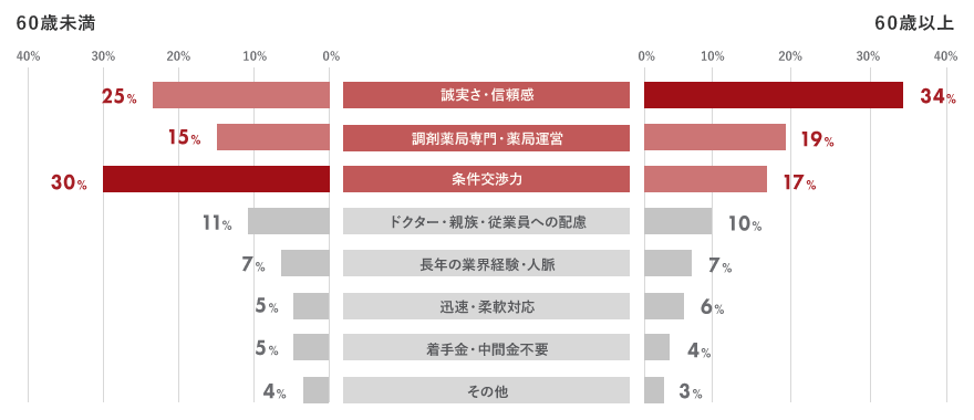 60歳以上の方には、信頼できる人物か、誠意があるか、など人格を重視されており、逆に40代~50代の方は、条件交渉力の面を重視されています。